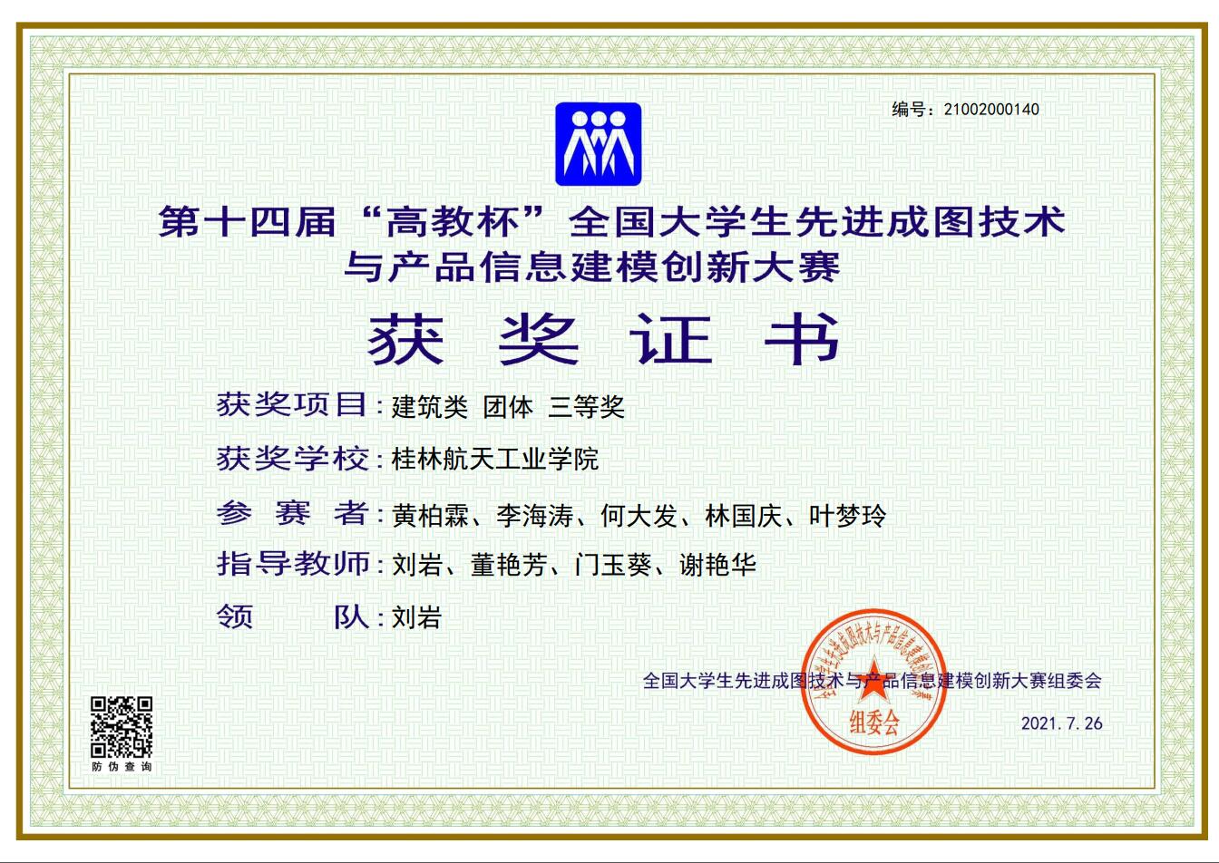 7月24日至26日,第十四届“高教杯”全国大学生先进成图技术与产品信息建模创新大赛在成都举行,因疫情原因,采取线上比赛方式。在比赛中,能源与建筑环境学院学子,取得了优异的成绩,其中由黄柏霖等人组成的开云kaiyun登录入口二队获得建筑类团体三等奖,何大发、黄柏霖、李海涛、林国庆获得建筑类个人全能三等奖。