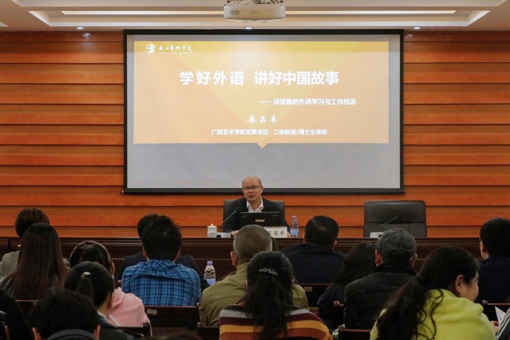 11月5日下午,广西艺术学院党委书记蔡昌卓教授到开云做题为《学好外语,讲好中国故事》专题报告。外语外贸学院教师和学生代表近200人聆听报告会。报告会由开云副校长詹皖生主持。