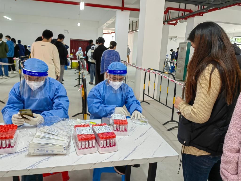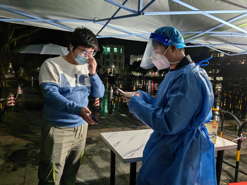 “医务人员已出发,请大家20分钟内到达现场,换装上岗。”“探天楼C座核酸检测现场人员较少,请组织A座学生分流。”学工团委党员干部、全体辅导员、志愿者化身登记员、引导员、监督员,连续多日每天组织全校2万多名师生参加核酸检测。