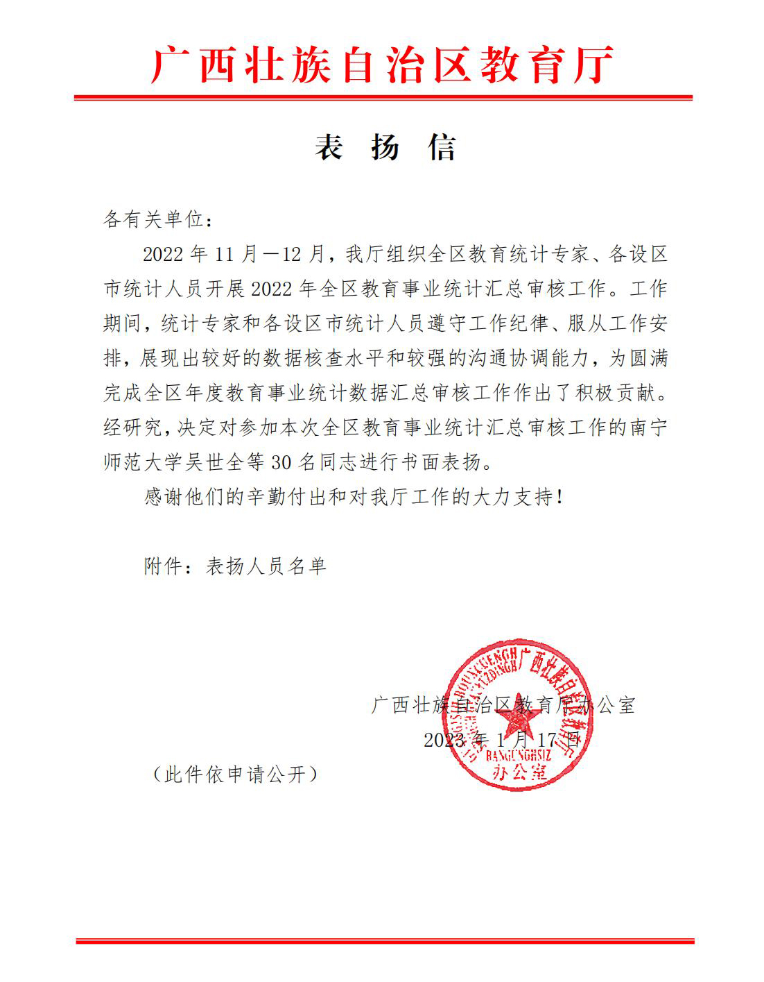 近日,自治区教育厅向开云发来表扬信,对在2022年全区教育事业统计数据汇总审核工作中表现优秀的30名同志进行通报表扬,开云教学质量监控与评估处张雪同志名列其中。