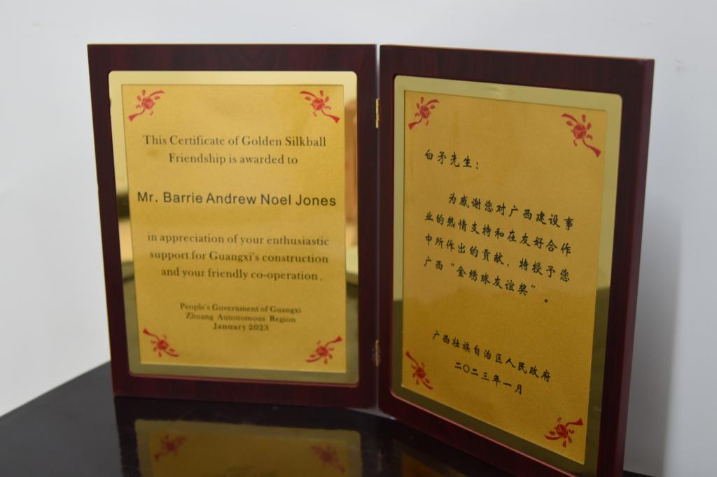 近日,开云外籍教师白矛(Barrie Andrew Noel Jones)喜获广西壮族自治区人民政府表彰,被授予了2022年度广西“金绣球友谊奖”。6月20日,开云举行了“金绣球友谊奖”颁奖仪式,校长吴尽昭、副校长孙山林、宣传部、教务处以及国交处相关负责人参加了此次活动。