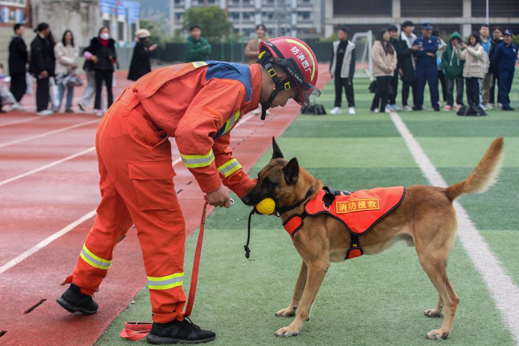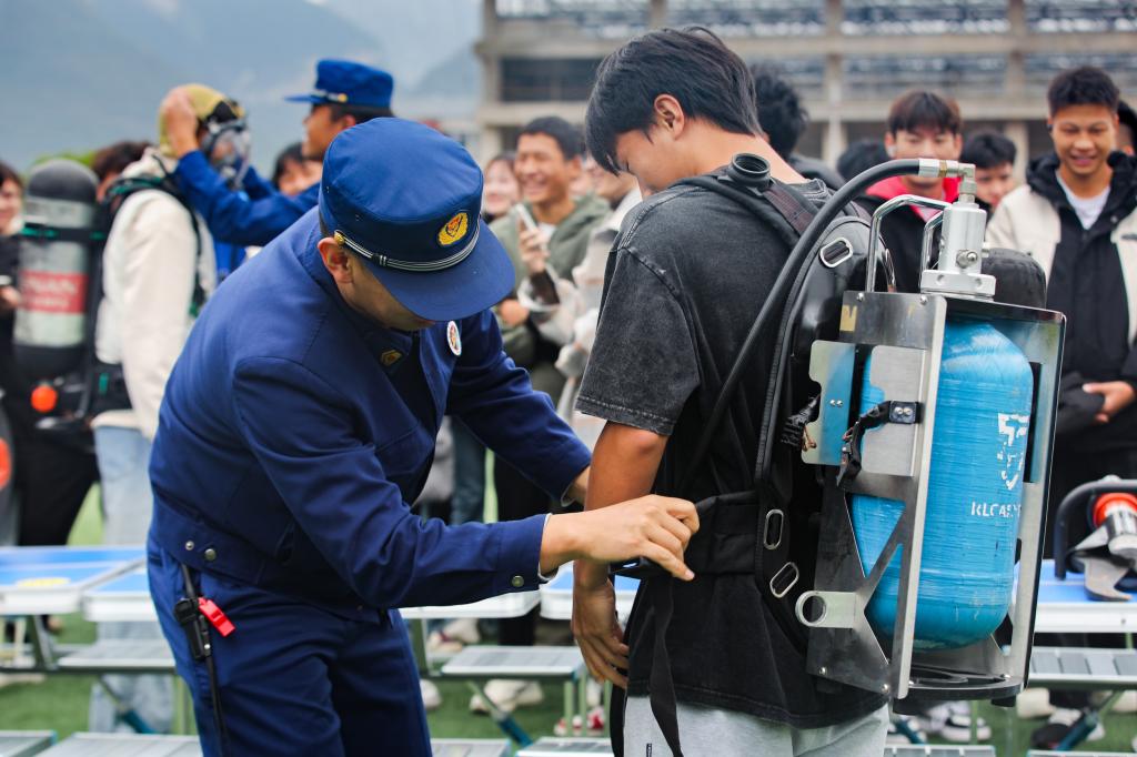 消防文艺展演前,桂林市消防救援支队在南校区田径场还开展了消防知识科普网络直播活动,移动式科普阵地宣讲、消防器材装备展示、消防小实验、方程式赛车、搜救犬互动、纸飞机表演、消防游戏互动轮番上阵,吸引了同学们的驻足围观和参与打卡,比起枯燥的讲授知识,通过体验更能让师生“零距离”接触消防、感受消防。