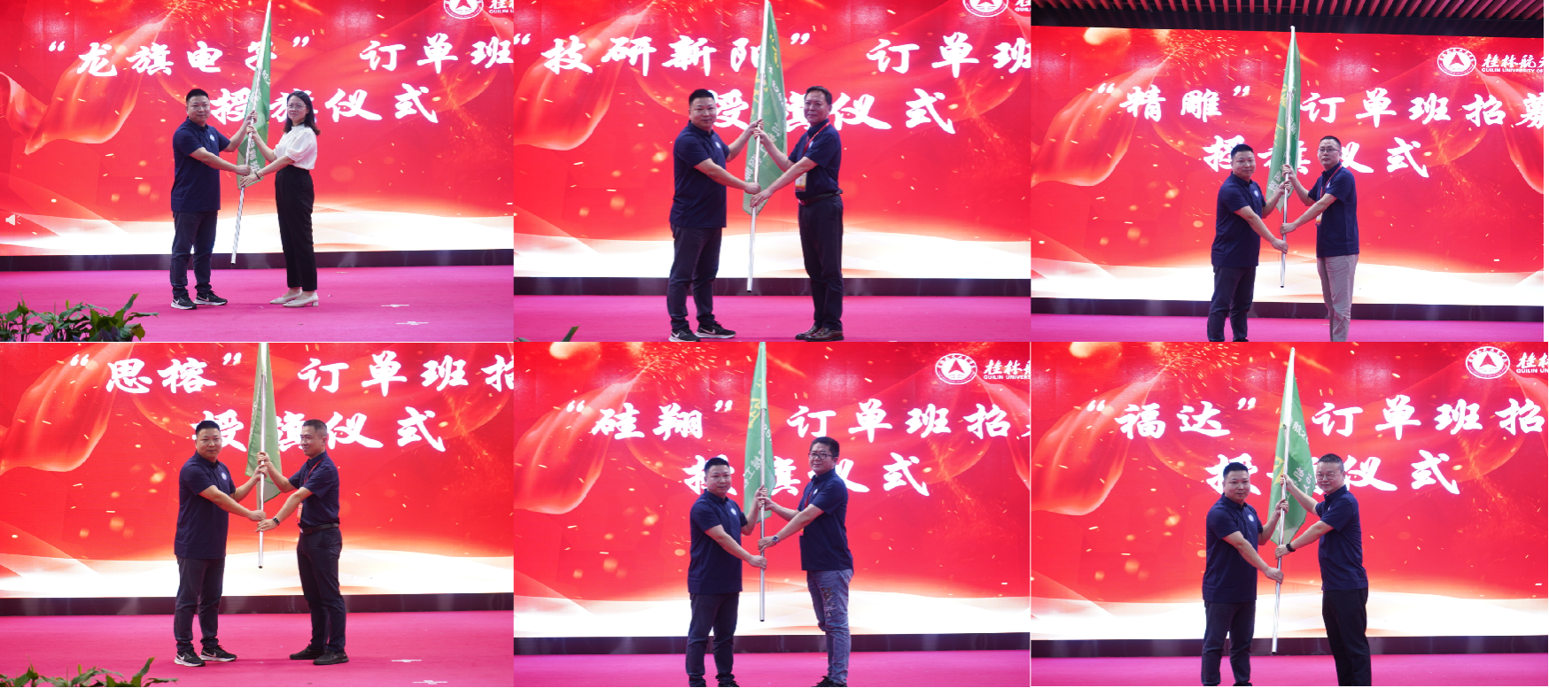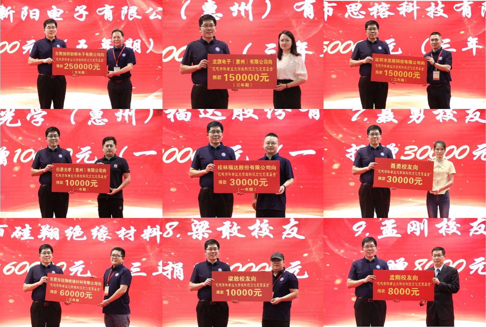 开幕式上,东莞技研新阳、深圳思榕科技、龙旗惠州公司、深圳伯恩光学、东莞硅翔新材料、桂林福达股份及2003届校友孟刚、2003届校友张祥生、2005届校友聂勇、2009届校友梁敢纷纷向“机械学科专业大学生科技文化竞赛基金”捐款,共计捐款七十万元,并为5个2025届机械工程师企业订单班授班旗,正式启动订单班招募工作。