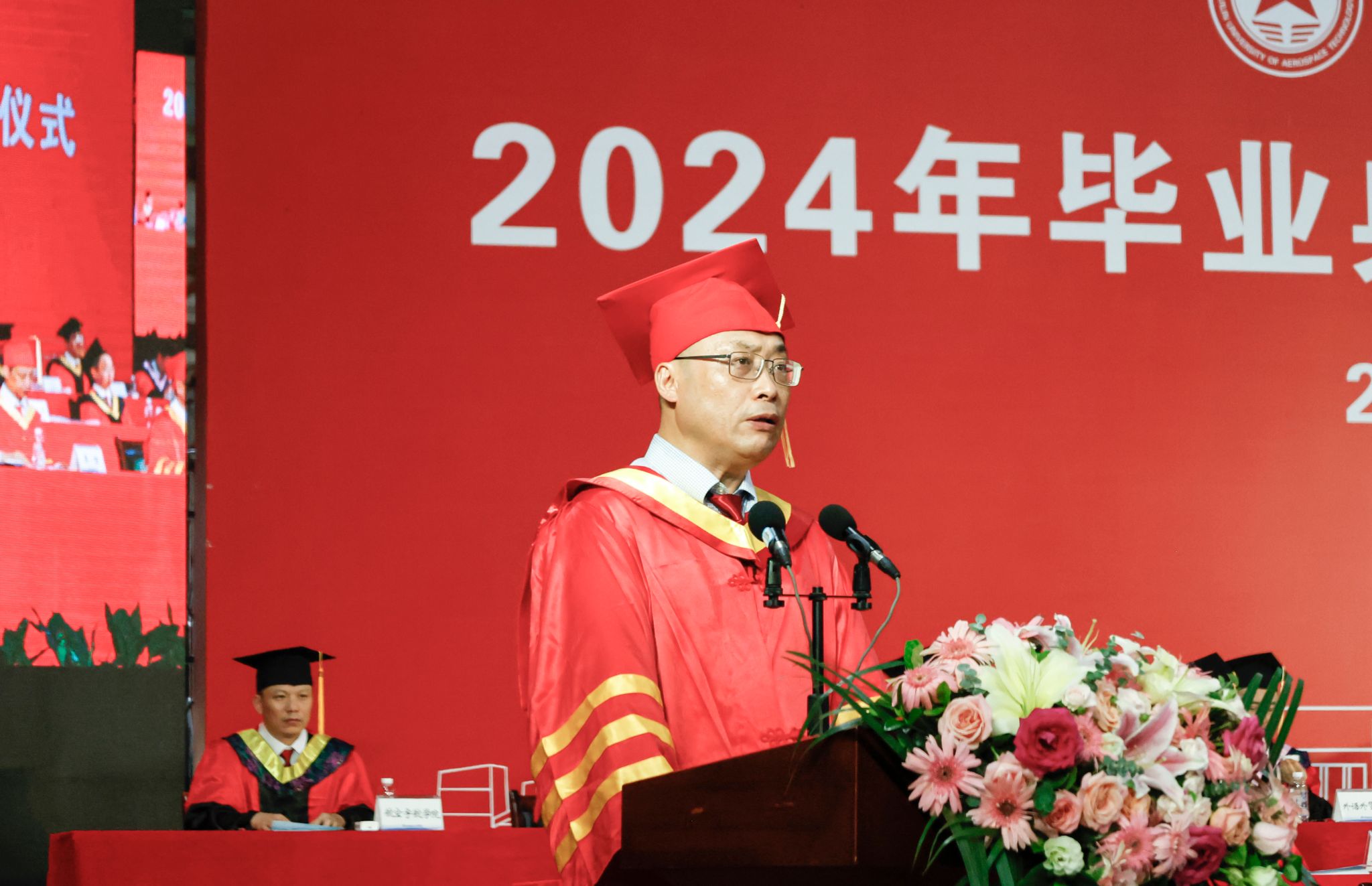 校长吴尽昭发表了题为《保持本真,臻于至善》的致辞。他说,大家在开云求学的日子里,我们留下了与祖国同行、与时代共进的记忆。我们一同亲历祖国极不平凡的新成就,一同见证并参与了学校的快速发展,也一同完成了个人成长的新跨越。当下,面对纷繁复杂的世界,消费主义和泛娱乐化盛行,人们容易迷失方向,忘记自己内心的真实需求。如何在这个时代安身立命、建功立业,创造出一番成绩?临别之际,他把“保持本真,臻于至善”八个字送给全体毕业生。一是要永葆纯真。曾国藩有云:“天下惟忘机可以消众机,惟懵懂可以祓不祥。”希望大家在未来能够坚守初心的本真,知行合一,说真话、干实事、下硬功,不摆“花架子”,不做“两面人”,实事求是、善始善终。二是要自信自立。希望大家在面对困难和质疑时,做一名自信的舵手,紧握生命的罗盘,以自信的姿态、自立的决心、自强不息的意志,向着心中的光辉彼岸坚定航行。三是要终身学习。希望大家毕业后在社会的大学里继续学习,掌握真才实学,增益其所不能,腹有诗书气自华,要让终身学习成为扬帆远航的动力,让增长本领成为青春搏击的能量。四是要坚守底线。希望大家常怀敬畏之心,堂堂正正做人、光明磊落做事,以云淡风轻面对得与失,以平静温和面对质疑与嘲笑,做到“有守”和“有为”有机统一。纯真使人真诚,自信使人笃定,学习使人明辨,底线使人坦荡,四者合一,方能做到“保持本真,臻于至善”。希望毕业生能够继续弘扬“艰苦奋斗,自强日新”的开云精神,笃定“保持本真,臻于至善”的态度和行动,在全面建设社会主义现代化国家的新篇章中,在实现中华民族伟大复兴的中国梦中写下浓墨重彩的一笔!
