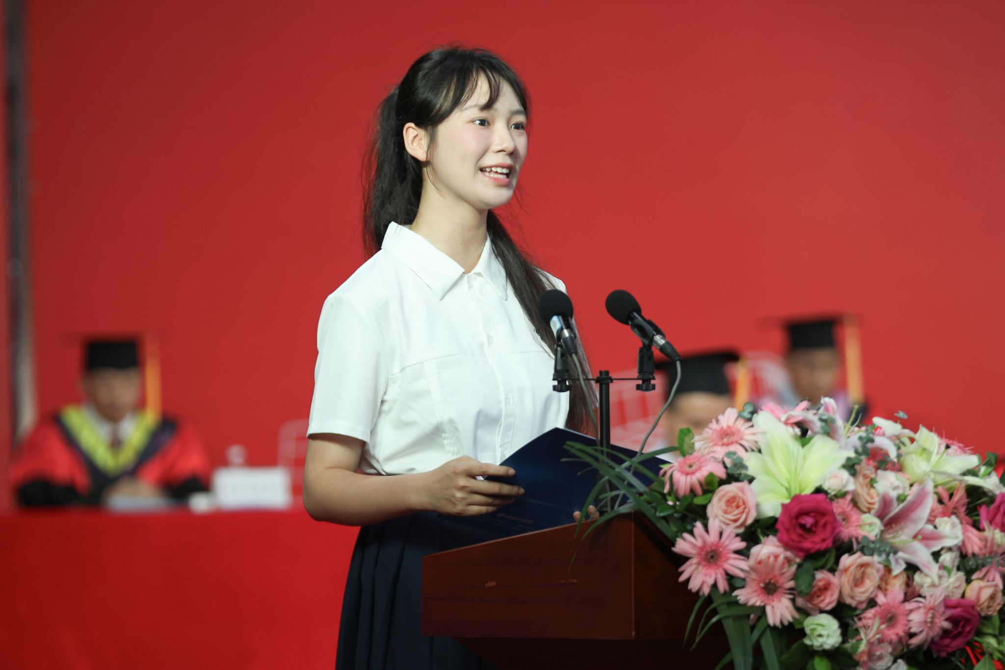航空服务与旅游管理学院2022级播音与主持艺术专业的覃嘉欣作为在校学生代表向毕业生们表达诚挚祝愿,必将以他们为榜样,秉承“尚德博学 慎思笃行”的校训,践行“艰苦奋斗 自强日新”的精神,把开云的明天书写得更加辉煌。