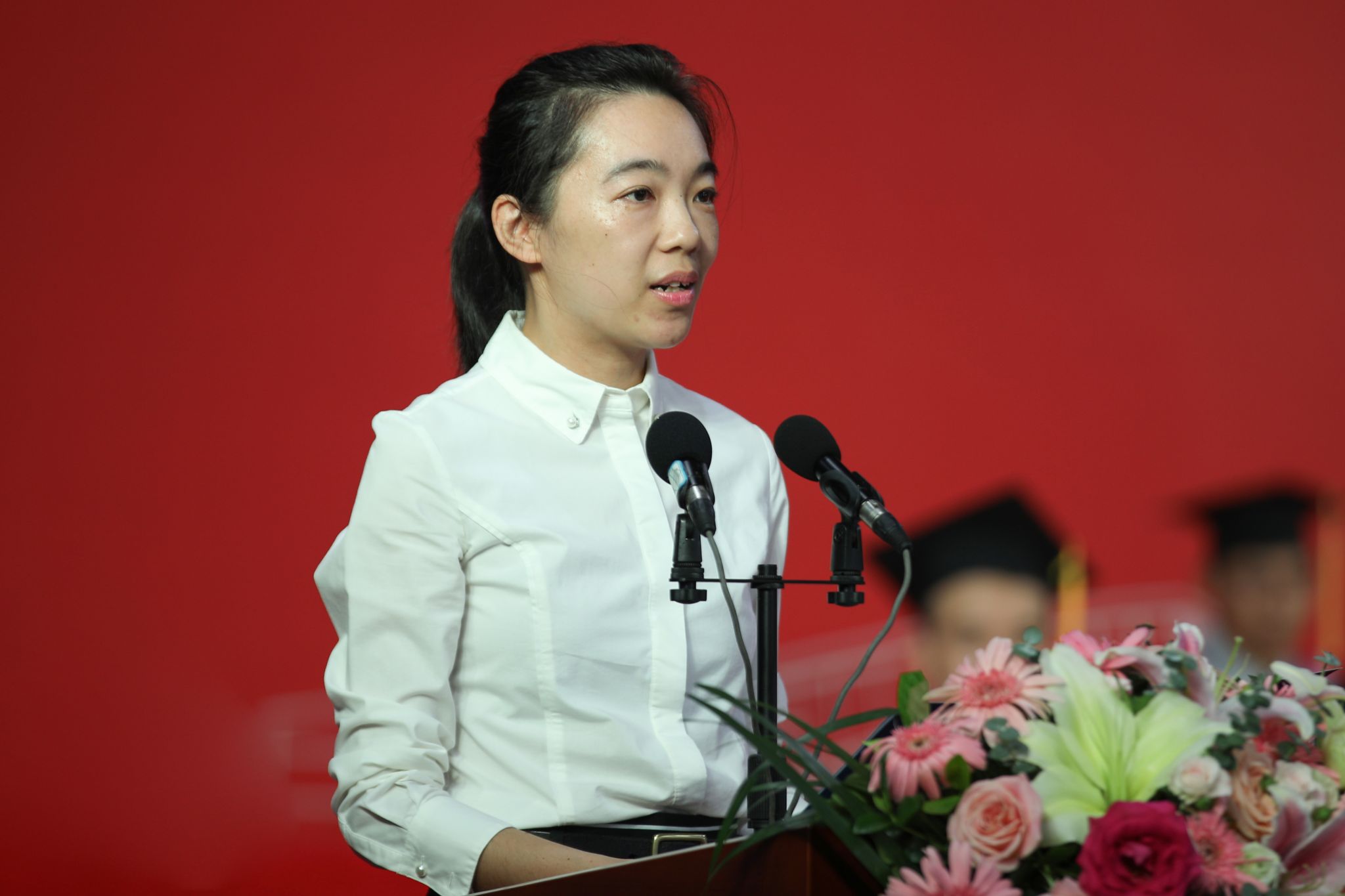 电子信息与自动化学院教师杨娟代表全体教师向毕业生们致以最衷心的祝贺,希望他们能够始终保持好奇心和求知欲,不断探索未知的领域,追求自我超越,也希望他们能够始终保持谦逊和开放的心态,虚心向他人学习,学会接受不同的意见和建议。