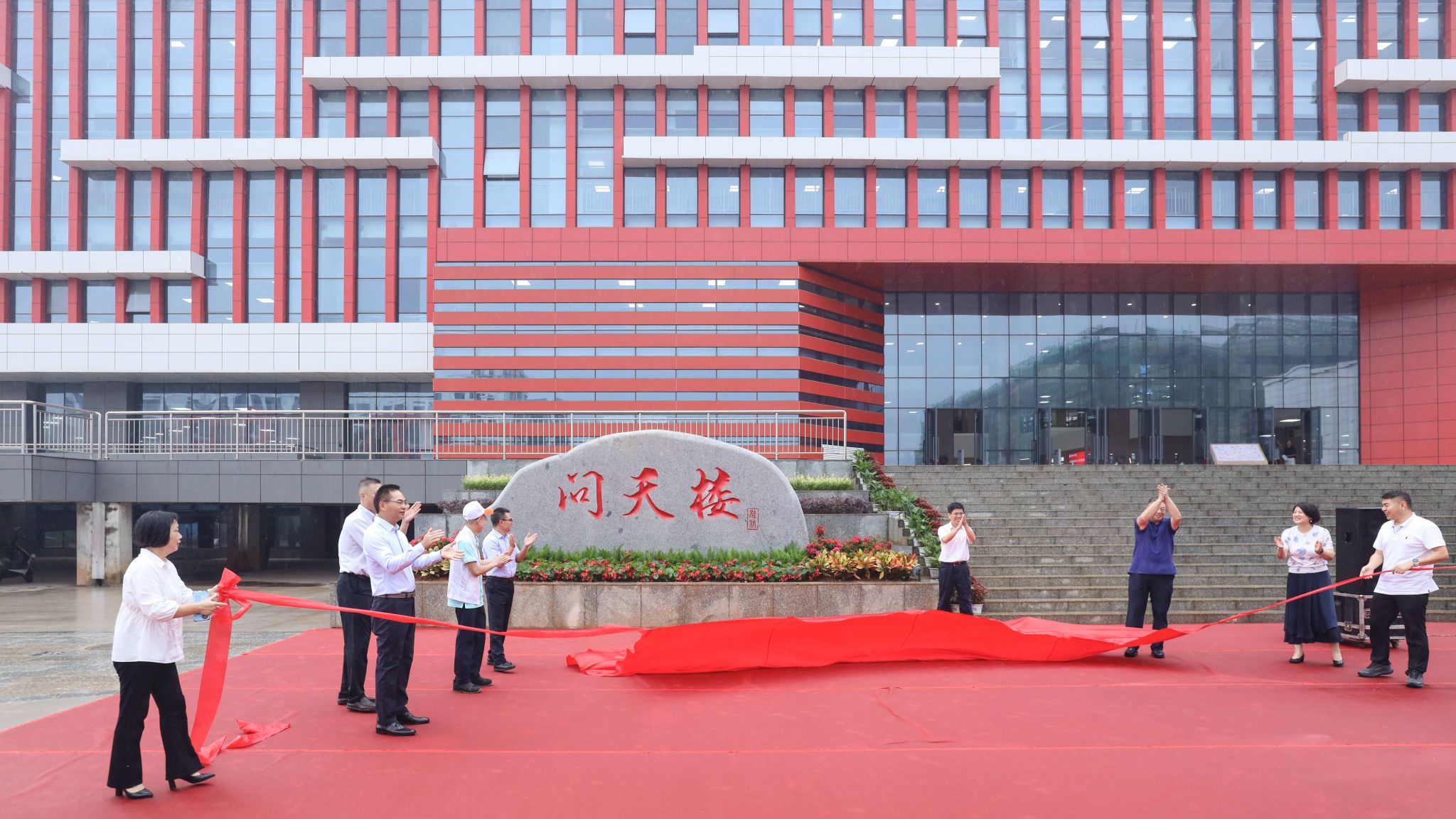 仪式期间,校友代表与校领导共同为篆刻着做出卓越贡献人员姓名的问天石揭幕。