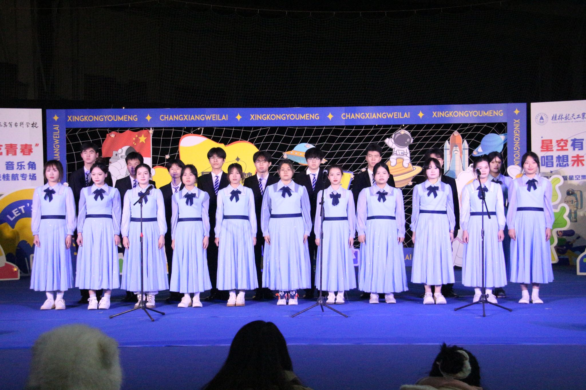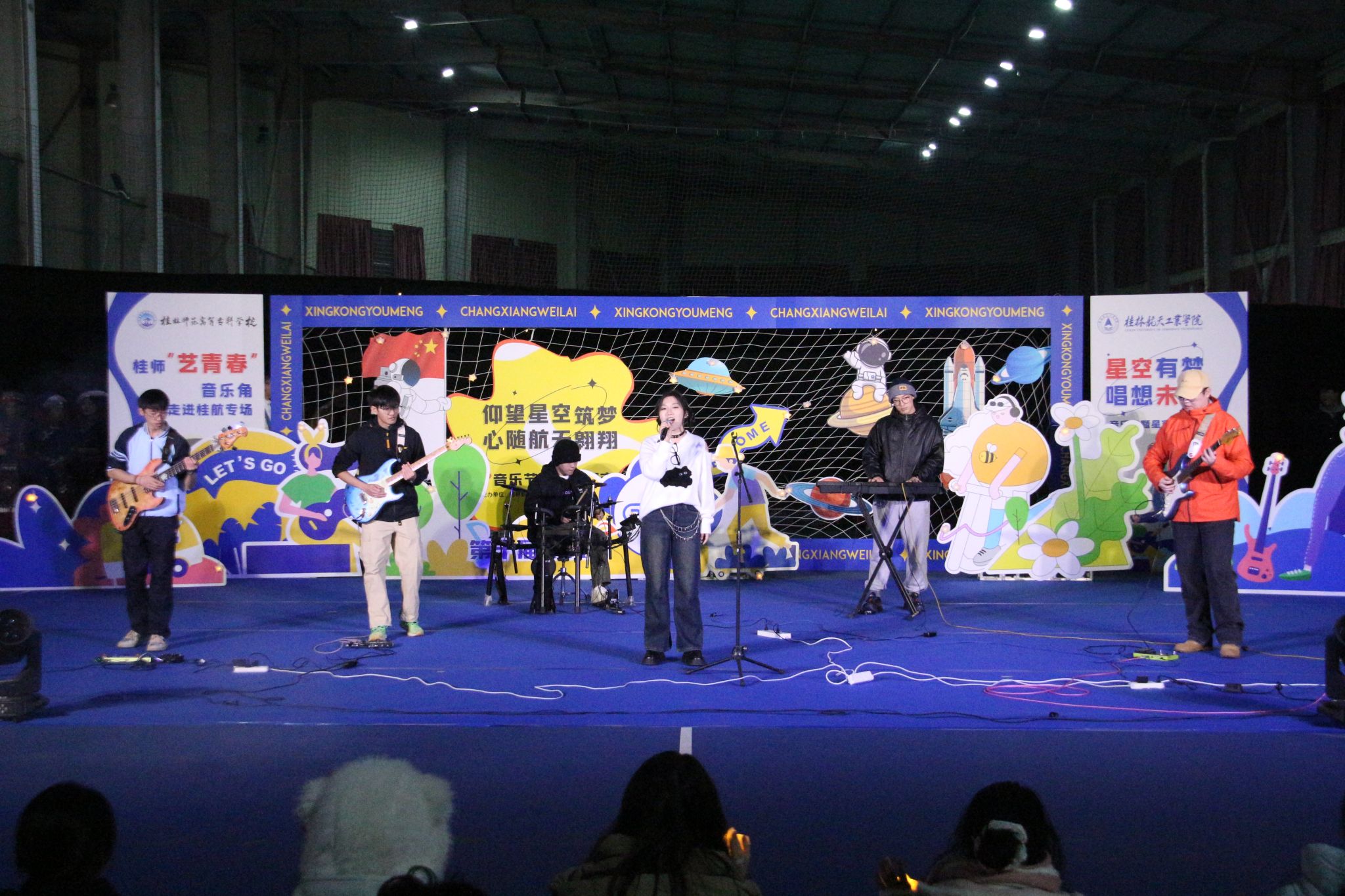 为进一步深化和加强校际合作,探索新时代高校美育浸润校园工作的新路径,12月12日晚,开云与桂林师范高等专科学校在南校区网球馆共同举办了第十届“航天日”系列活动——“星空有梦、唱想未来”音乐节暨星空集市。校党委副书记、纪委书记吴江萍,桂林师范高等专科学校音乐系党总支书记周宪斌,以及两校相关部门负责人、学生代表1000余人参加了本次活动。