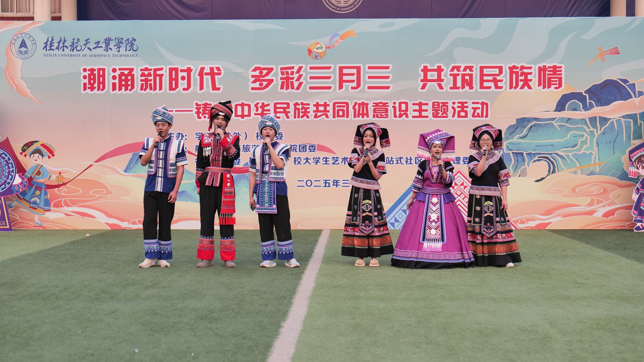 活动开场前,入场舞蹈竹竿舞“清脆竹声奏响千年韵律,跃动脚步踏出团结欢歌”,在节奏与碰撞中,感受传统与现代的交融,见证团结协作的力量。歌伴舞《问月》、歌曲《山歌好比春江水》以歌会友,以舞传情,用歌声与舞蹈传递壮族传统文化的独特魅力。与北华航天工业学院联袂呈现的《上春山》生动诠释校际情谊,以艺术共绘民族团结奋进画卷,这不仅是艺术的交流,更是两校友谊的见证。舞蹈《相亲相爱》将全场气氛点燃到最高点,象征着五十六个民族像石榴籽一样,紧紧的抱在一起,共同书写着中华民族的辉煌篇章。