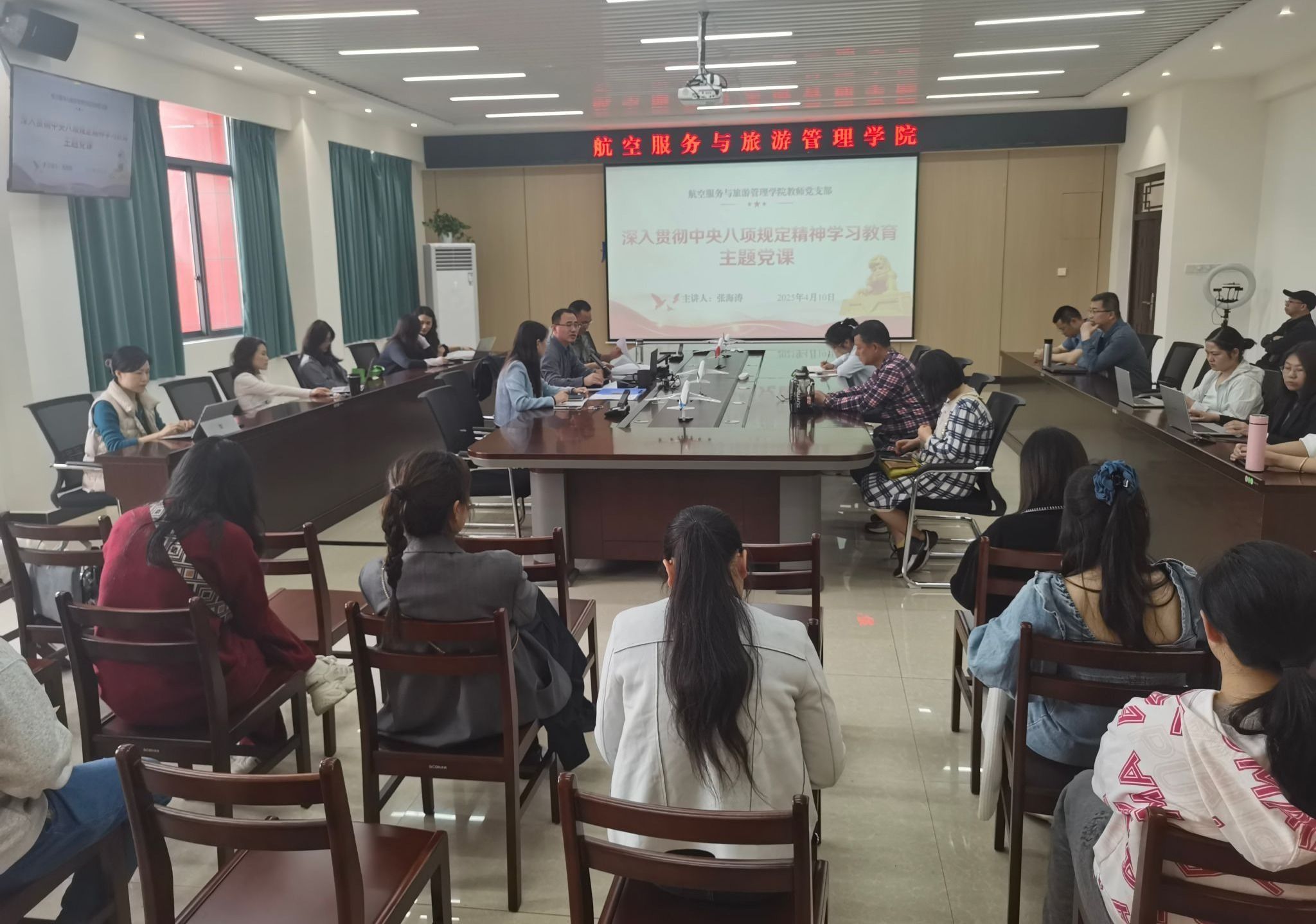 航空服务与旅游管理学院党委开展主题教育读书班,组织师生党员开展深入贯彻中央八项规定精神学习教育主题党课,强调党员干部要切实改进工作作风,注重精简高效,坚持求真务实,培养自律意识,坚决反对形式主义、官僚主义、享乐主义、奢靡之风,养成俭朴之风,重视生活作风和家风建设,保持清醒头脑,筑牢精神堤坝;强调学生党员要在学习、工作、生活、社交上践行中央八项规定精神:在学习上要端正学风,杜绝考试作弊、论文抄袭;在工作上要务实高效,在学生活动和校园文化建设中发挥引领作用;在生活上要勤俭节约,抵制网络贷款和提前享乐消费;在社交上要保持纯洁人际关系,不搞“小圈子”“拉帮结派”。