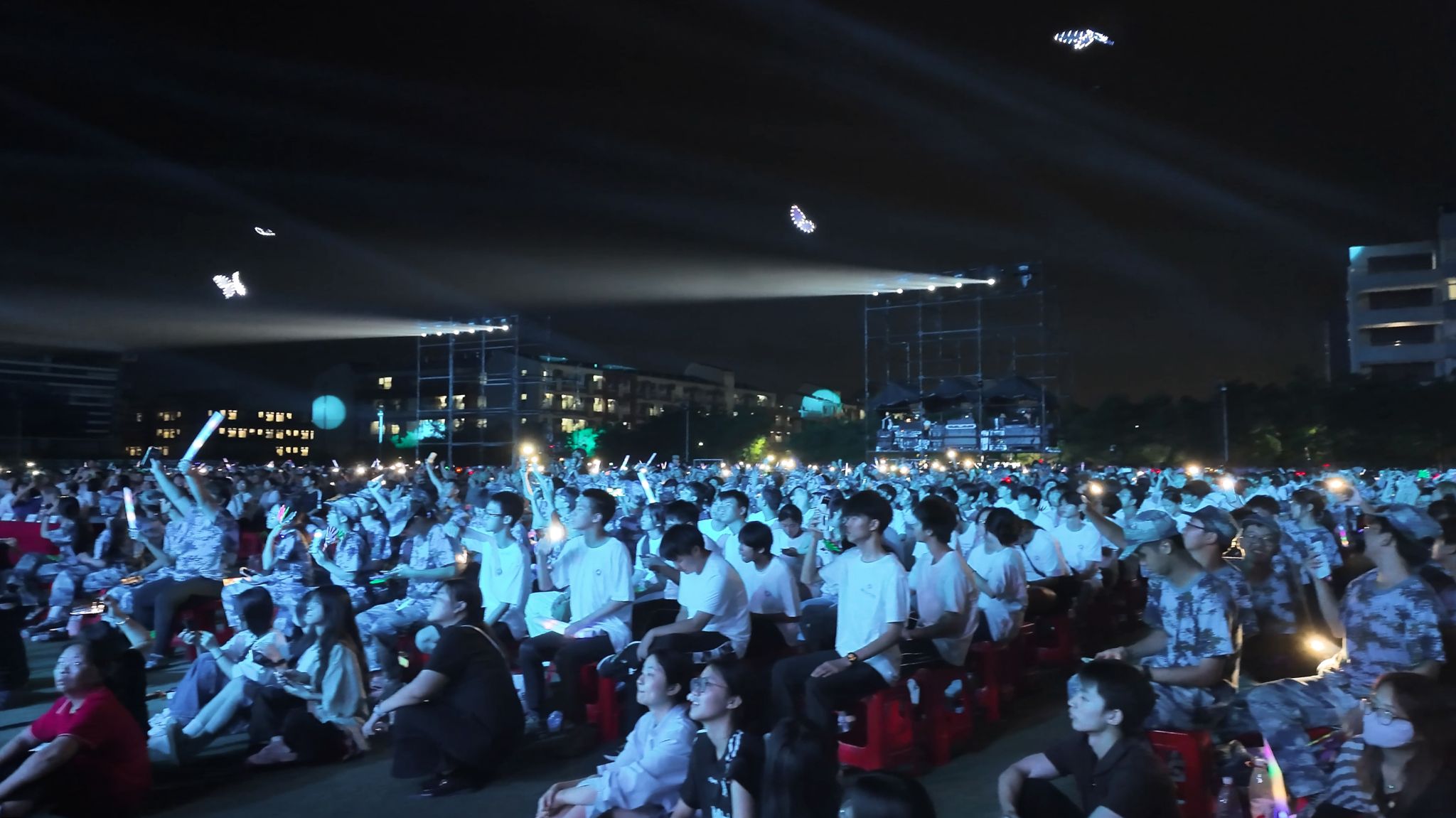 晚会尾声,合唱《初光》《蝴蝶泉边》《我爱你中国》将现场氛围推向高潮。在《蝴蝶泉边》婉转的旋律中,五架蝴蝶扑翼机在夜空中划出绚丽弧线,象征着青春梦想自由翱翔。最后在《我爱你中国》的歌声中,凤凰航空模型起飞,全场师生齐声高歌,用歌声表达对祖国的热爱与祝福。