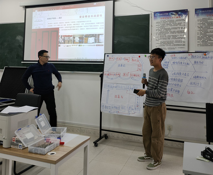 本次实验以生产飞机模型为主线,实验开始前,马老师首先从工业工程的关键知识点结合飞机生产的主要环节展开,加深了同学们对精益实战道场的理解。实验过程中,老师组织同学们开展实操训练并手把手进行指导。实验结束后,还组织同学们进行了现场分享,总结和分析生产过程中存在的问题。