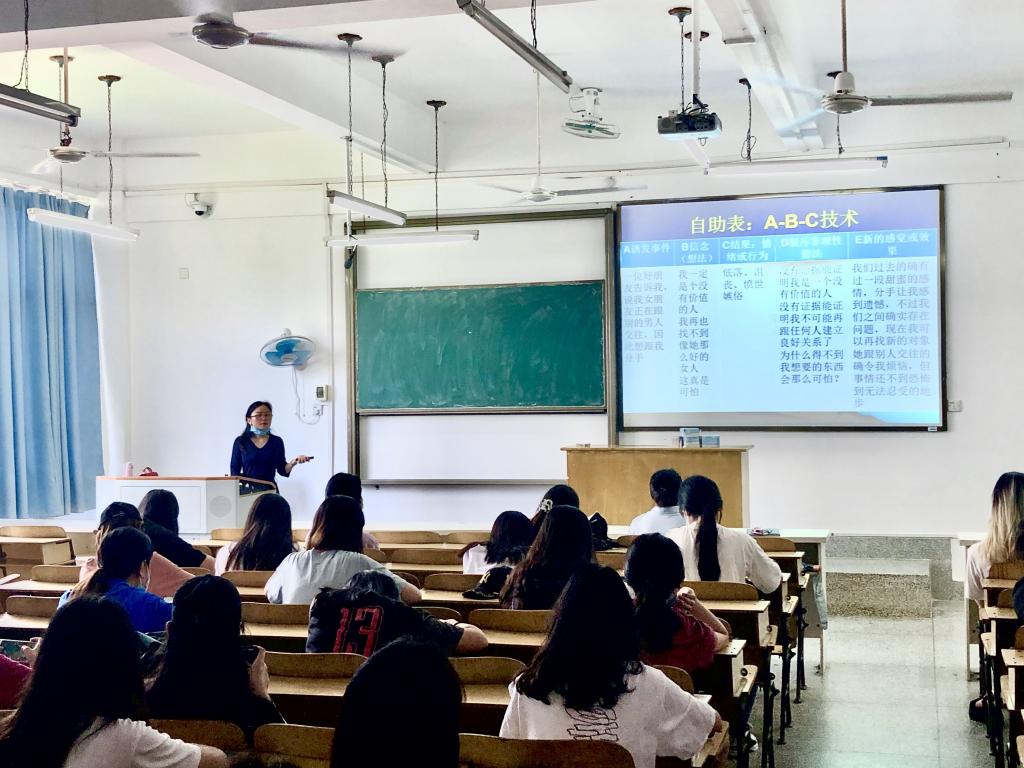 讲座中,主讲人就大学生学习与心理健康、大学生情绪管理与心理健康、大学生人际沟通与心理健康、大学生恋爱与心理健康、疫情下大学生的心理调适等五大问题进行了深入分析。其中,杨颖思老师重点以“心态”和“情绪”为两大话题,向同学们详细介绍了情绪的产生、不同情绪的产生的原因,以及如何避免出现负面情绪、如何正确调节已出现的不良情绪等问题。杨颖思老师指导同学们在收受到情绪影响时,可以用“A-B-C技术”进行自检。在讲座过程中杨老师多次援引现实生活中的案例,让同学们通过案例切身感受,引导同学们在生活中正确调节自己出现的不良情绪等问题。