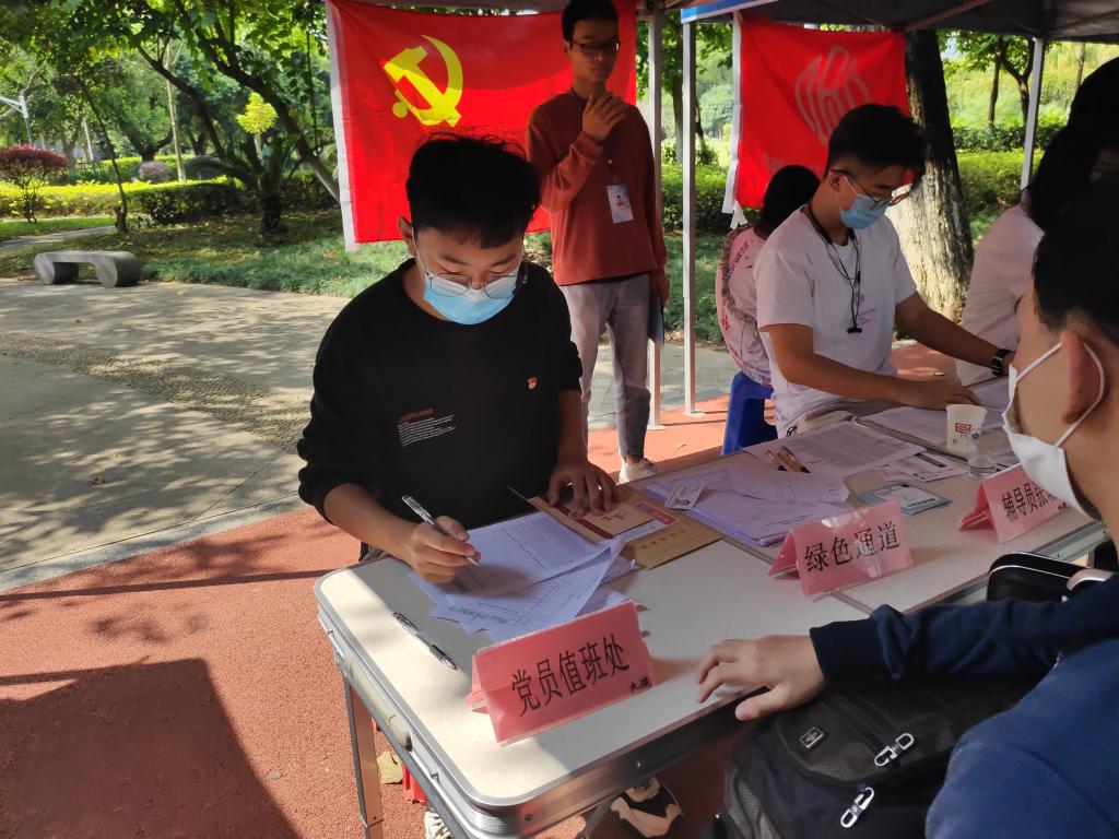 迎新期间,党员先锋队队员们统一佩戴党徽和口罩参加迎新工作,设置“党员服务站”,提供体温枪、一次性口罩、免洗手消毒凝胶等用品,为新生和家长们入校报到的疫情防护安全保驾护航。