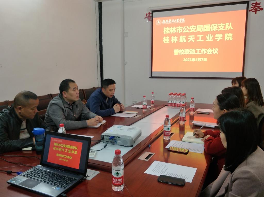 4月7日,学校在飞天楼118B会议室召开警校联动工作会议,桂林市公安局国保支队、学工处、科技处、保卫处、国际交流处、校团委主要负责人及相关人员参加会议。
