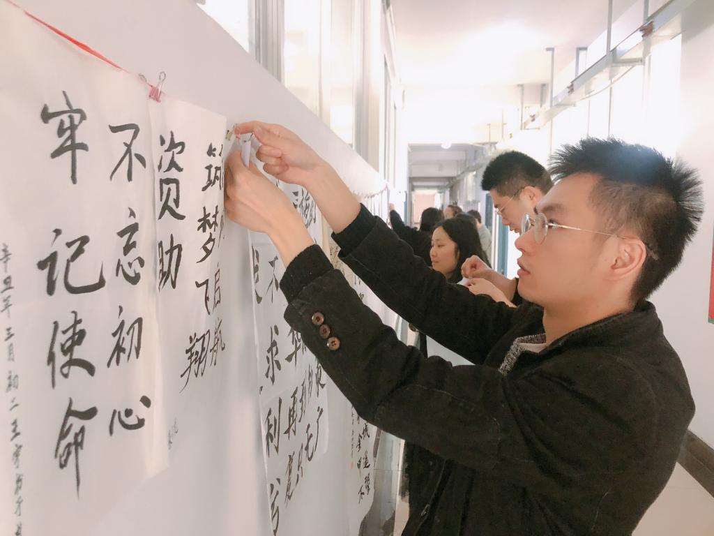 比赛分为硬笔和软笔两种形式,共收到36幅书法作品,内容包括习近平总书记关于扶贫工作重要论述、爱国爱党诗词和学生资助政策等。展览现场吸引了一大批学院师生参观并为优秀作品贴上小红花。最终,2020级材料成型及控制工程专业2班秦浩然以51票获得了软笔作品第一名,2020级机械设计制造及其自动化3班石舒迅以28票获得了硬笔作品第一名。