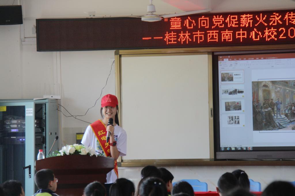 “红电先锋”宣讲团指导老师给孩子们讲了一节生动的党课。老师简要介绍了党的发展历史,并从小学语文课本内容、学科实践活动、作文习作等三个方面分享了如何学习党史,结合习近平总书记赴桂林考察重点关注的回望湘江战役、推进乡村振兴、检验漓江生态治理和保护等方面,让同学们感知共产党人的奋斗之志。她对这些贫困村的孩子们提出希望:作为中华学子,定要学党史、感党恩、跟党走,传承红色基因,争取长大成为为社会贡献一份力量的有用之才。