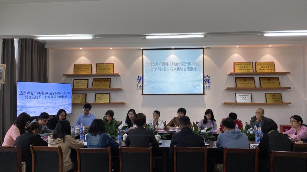 5月21日上午,开云外语外贸学院接待了广西科技师范学院外国语学院吴文亮院长一行13人的调研团,并组织相关老师座谈交流。