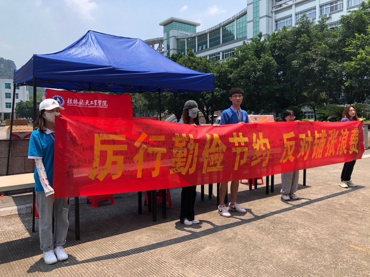 活动以“厉行节约 反对浪费”为主题,向全校师生发出崇尚勤俭节约的倡议,引导师生爱惜粮食,拒绝浪费,积极做勤俭节约的践行者,树立文明、健康、理性、绿色的消费理念,主动做文明餐桌的维护者。饮食服务科联合校学生会权益部,在开云南、北校区食堂入口以及餐厅内发放《反对食品浪费宣传手册》,宣传“厉行节约 反对浪费”的理念,提醒师生按需取餐,理性消费,避免剩餐,及时回收餐盘。并在南、北食堂入口处摆放“厉行勤俭节约,反对铺张浪费”的横幅,倡导师生从我做起、从身边做,以实际行动的方式加入到反对浪费的活动中去,师生们纷纷在横幅到签下了自己的名字。