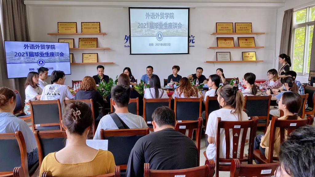 6月22日,外语外贸学院2021届毕业生座谈会在学院301会议室举行,全体院领导、专业教研室主任、毕业班辅导员以及各专业毕业生代表参加了座谈会。