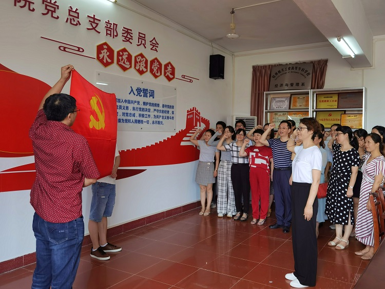 在党的百年华诞之际,管理学院以支部为单位,组织党员面向鲜艳的党旗,重温入党誓词。这是管理学院党总支开展党史学习教育的一项重要内容。