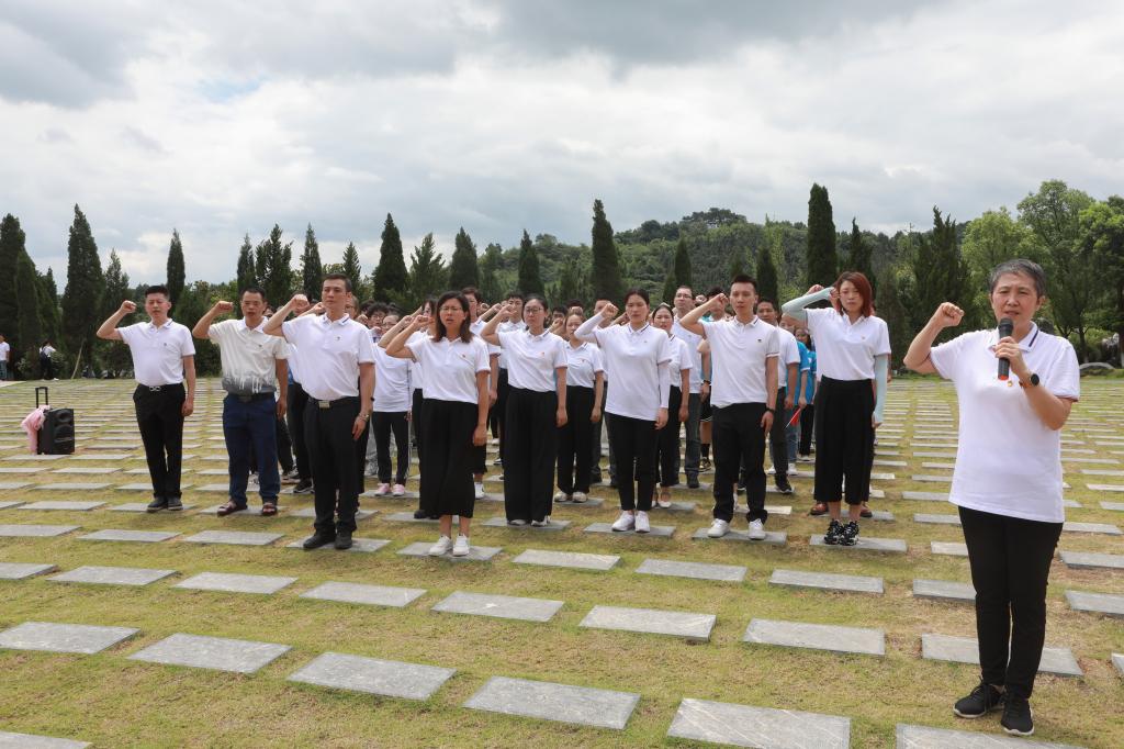 在湘江战役纪念馆,党员同志们紧跟讲解员,观一幅幅珍贵的文物照片,看一座座逼真的战场模型,听一段段催人奋进的历史故事,深切体会红军战士和革命先辈为理想信念而战斗的那段峥嵘岁月,被“勇于突破,敢于胜利,向死而生”的革命精神所感染。随后,党员同志们来到凭吊广场,整齐列队,庄严肃穆,向革命烈士敬献花篮,追思忠魂,缅怀红军战士为了革命胜利而立下的丰功伟绩。面向宏伟的英雄雕像墙和鲜红的党旗,全体党员高举右手,重温入党誓词,展现了同志们为党的伟大事业而接续奋斗的初心和使命。