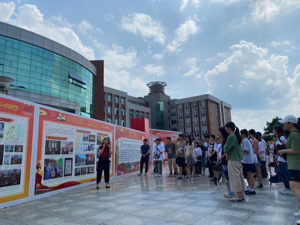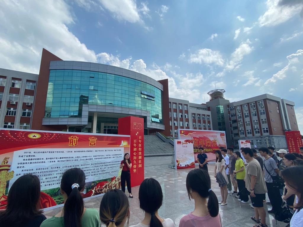 为庆祝中国共产党成立100周年,有力推动党史学习教育,拓展学生党员加强“四史”学习教育平台,传媒与艺术设计学院学生党支部于7月5日组织50余名党员到南校区钱学森广场参观中国共产党成立100周年图片展。