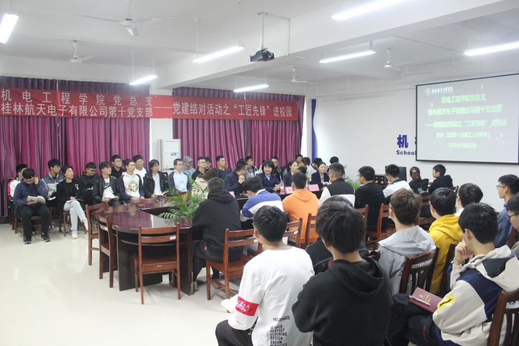10月23日下午,机电工程学院党总支和桂林航天电子有限公司第十党支部联合举办“航天工匠先锋进校园”主题讲座活动在巡天楼205会议室举行。桂林航天电子有限公司第五党支部书记林媛,第十党支部委员王玲、“全国工人先锋号”绕线班组长沈正欢,学院团委书记、学生党支部书记及60余名学生代表参加活动。