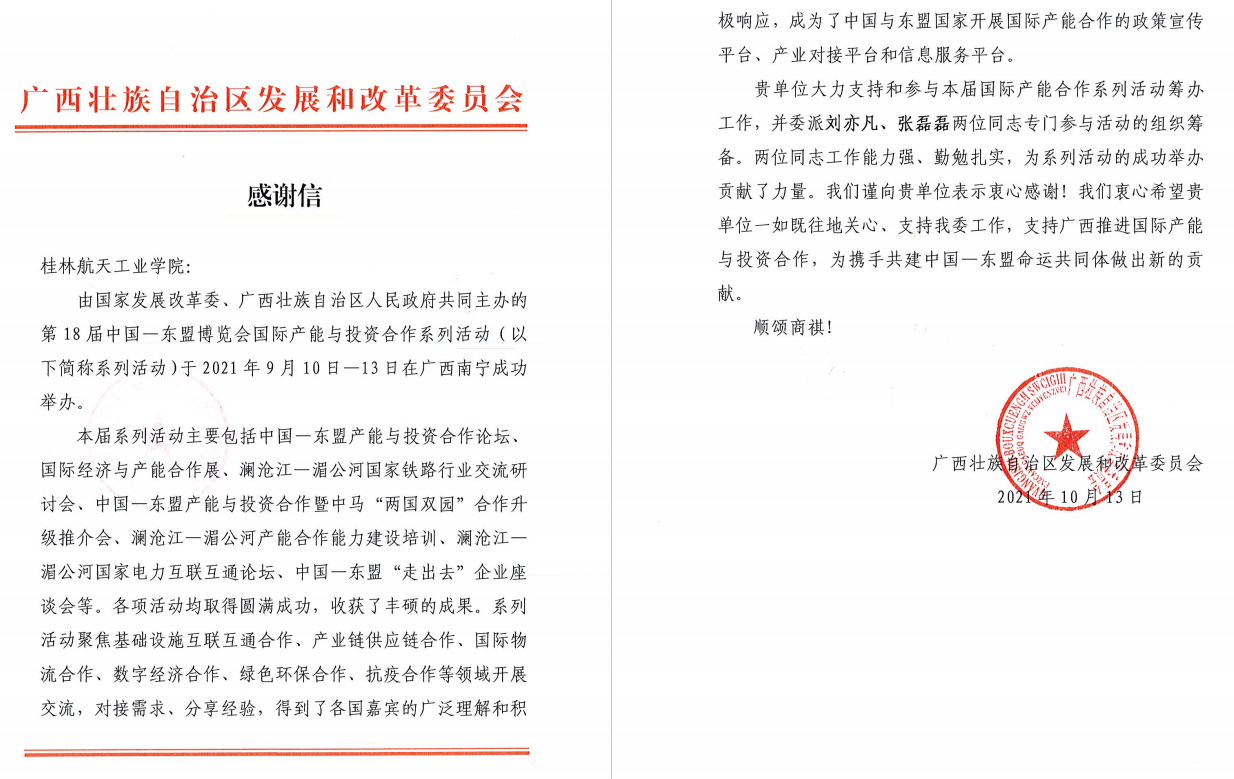 近日,自治区发展和改革委员会给学校发来感谢信。来信指出,由国家发展改革委、广西壮族自治区人民政府共同主办的“第18届中国—东盟博览会国际产能与投资合作系列活动”在南宁市成功举办。此次系列活动规格高,任务重,经过精心准备,各项活动均取得圆满成功,收获了丰硕成果,得到了参会各国嘉宾的好评。开云kaiyun登录入口大力支持上述系列活动的筹办,选派了刘亦凡、张磊磊两位同志参与组织筹备工作。委派的同志工作能力强,勤勉扎实,为系列活动的成功举办贡献了力量。自治区发展和改革委员会向学校表示衷心感谢!