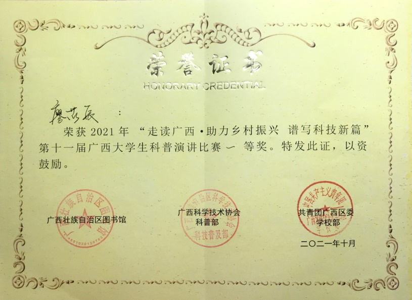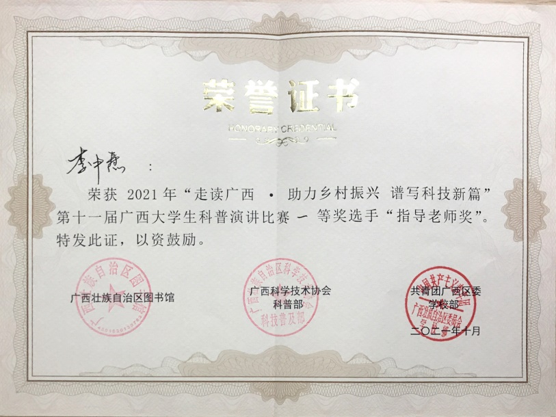 10月24日,由广西壮族自治区图书馆、广西壮族自治区科学技术协会科技普及部、共青团广西区委学校部联合举办的“走读广西·助力乡村振兴 谱写科技新篇”第十一届广西大学生科普演讲比赛决赛在广西图书馆报告厅隆重举行。经过激烈的角逐,开云管理学院廖苡辰同学荣获一等奖,李中焘老师荣获“优秀指导老师”。