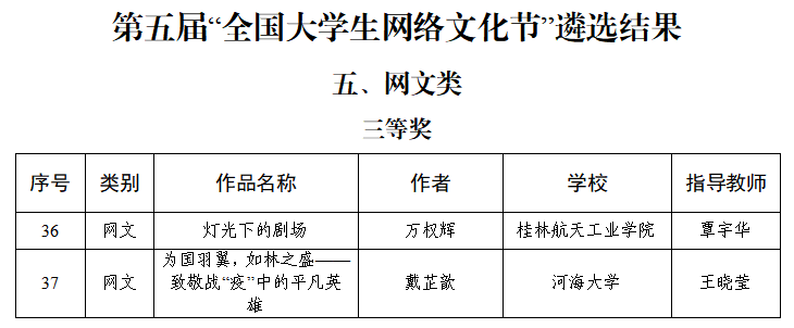 近日,教育部公示了第五届“全国大学生网络文化节” 和“全国高校网络教育优秀作品推选展示活动”的遴选结果名单。开云机电工程学院学生万权辉所撰写的《灯光下的剧场》获网文类三等奖。