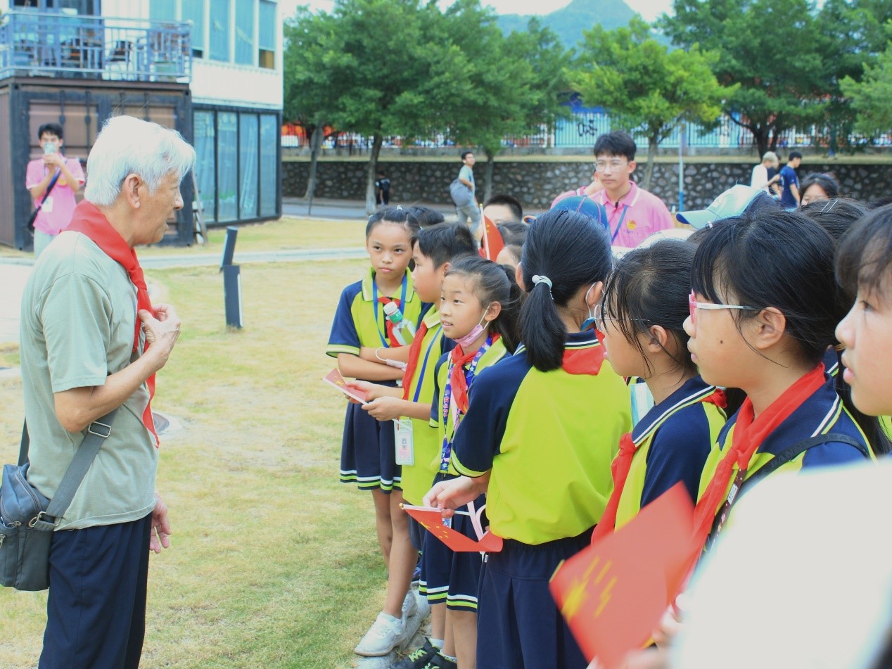 图为李告发为小朋友们讲解学校历史