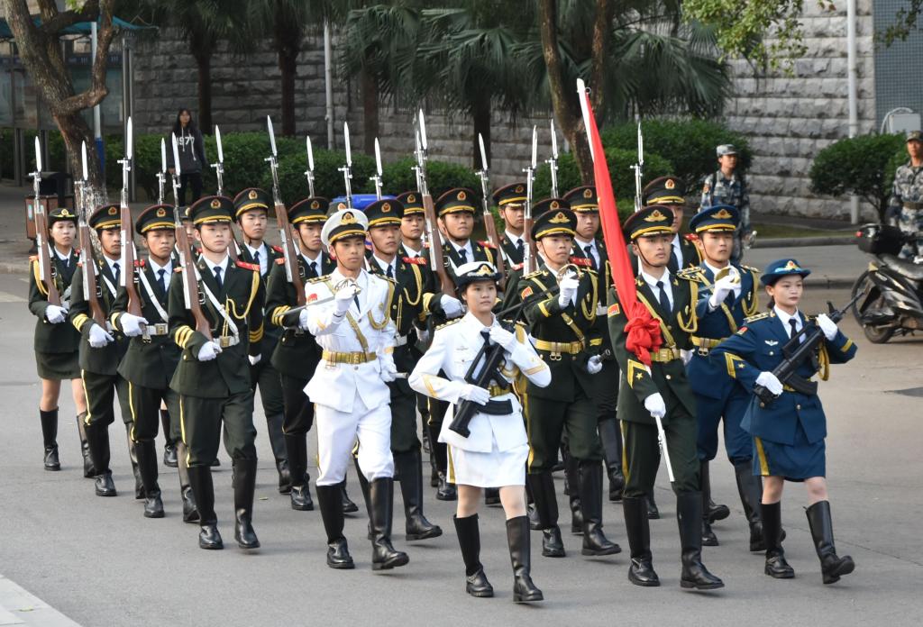 伴随雄壮的《义勇军进行曲》,英姿飒爽的国旗护卫队队员们护送鲜艳的五星红旗进场,全体齐唱国歌,在师生深情地注目礼下,五星红旗冉冉升起,迎风飘扬。