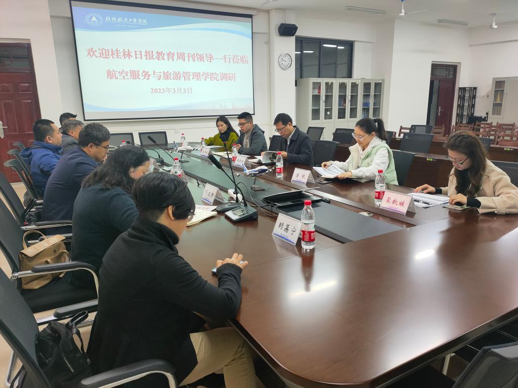 校企合作促就业,交流研讨谋发展。为深入学习宣传贯彻党的二十大精神,更好服务科教兴国战略,近日,桂林日报教育周刊主任吴林峰、融创桂林旅游度假区人力行政总监王强,受邀分别带队来校走访交流。航空服务与旅游管理学院负责人以及相关专业教师参加了交流研讨活动。