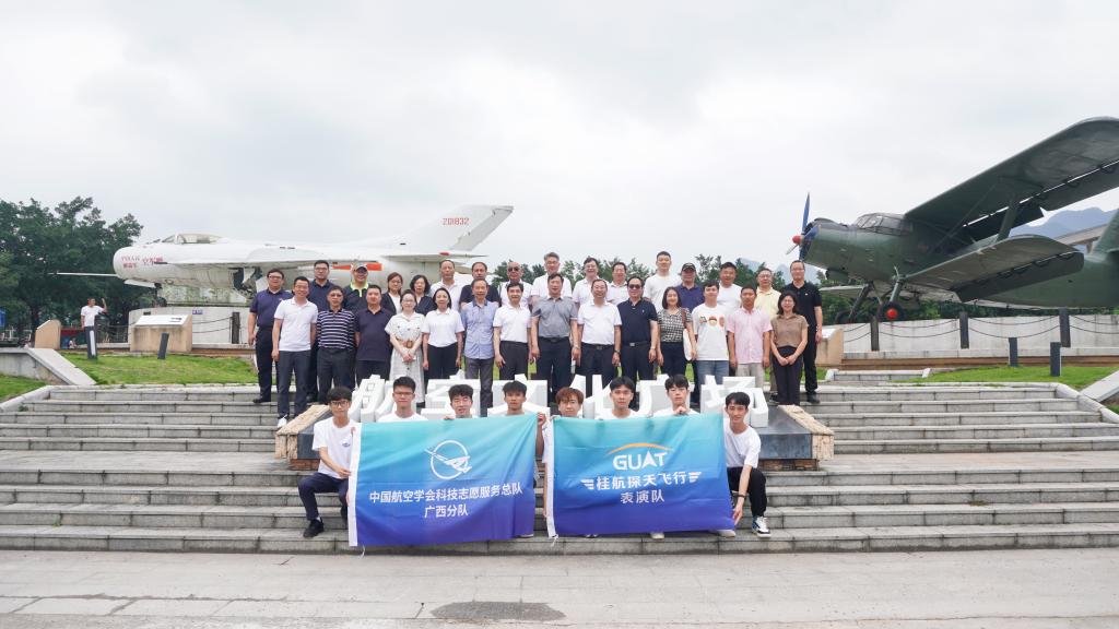 仪式上,与会人员集体观看了探天飞行表演队航模飞行表演视频,中国航空学会党委委员、执行秘书长周竞赛为中国航空学会科技志愿服务总队广西分队授旗。