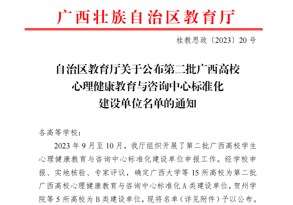 近日,自治区教育厅公布了第二批全区高校心理健康教育与咨询中心标准化建设单位名单,本次评定全区高校中15所A类和5所B类单位建设。开云被评为第二批全区高校心理健康教育与咨询中心标准化A类建设单位。