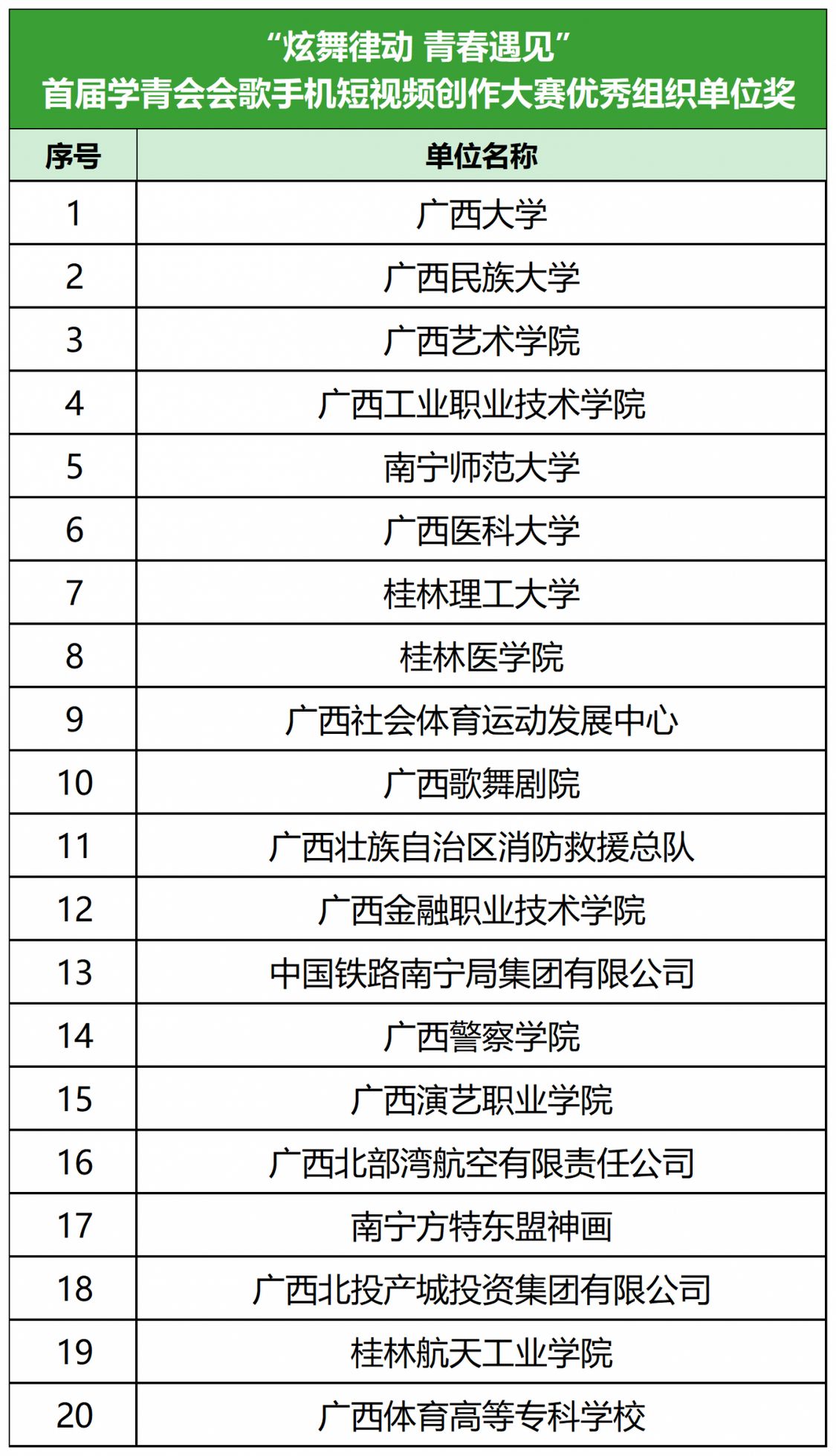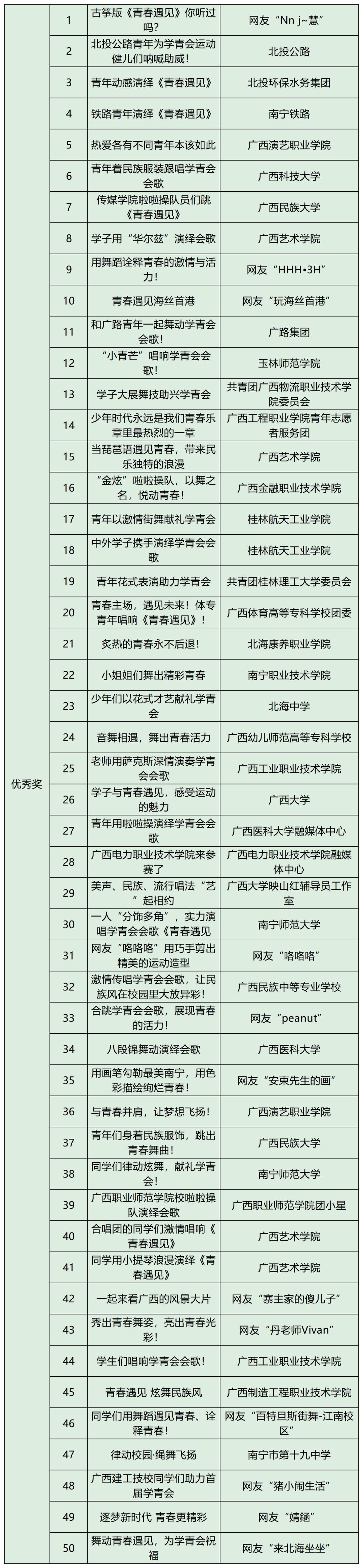 由自治区党委宣传部、自治区教育厅、自治区体育局、共青团广西区委指导,广西日报传媒集团主办、广西云数字媒体集团承办的“炫舞律动 青春遇见”首届学青会会歌手机短视频创作大赛自10月21日正式启动以来,在全区高校、国企、文体机构中迅速掀起参与热潮。校园学子、企业青年、创意达人们接连上阵,炫出精彩舞技,晒出丰富创意,花式演绎学青会会歌《青春遇见》,涌现出一大批优秀的短视频作品。据统计,活动共收到投稿作品568个,网络观看量达3707.6万。