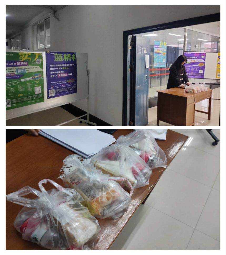 考虑到赛事持续时间长,学院从人文关怀的角度出发,组织志愿者为考生们准备了矿泉水、面包等营养补给品,为考生充电加油。