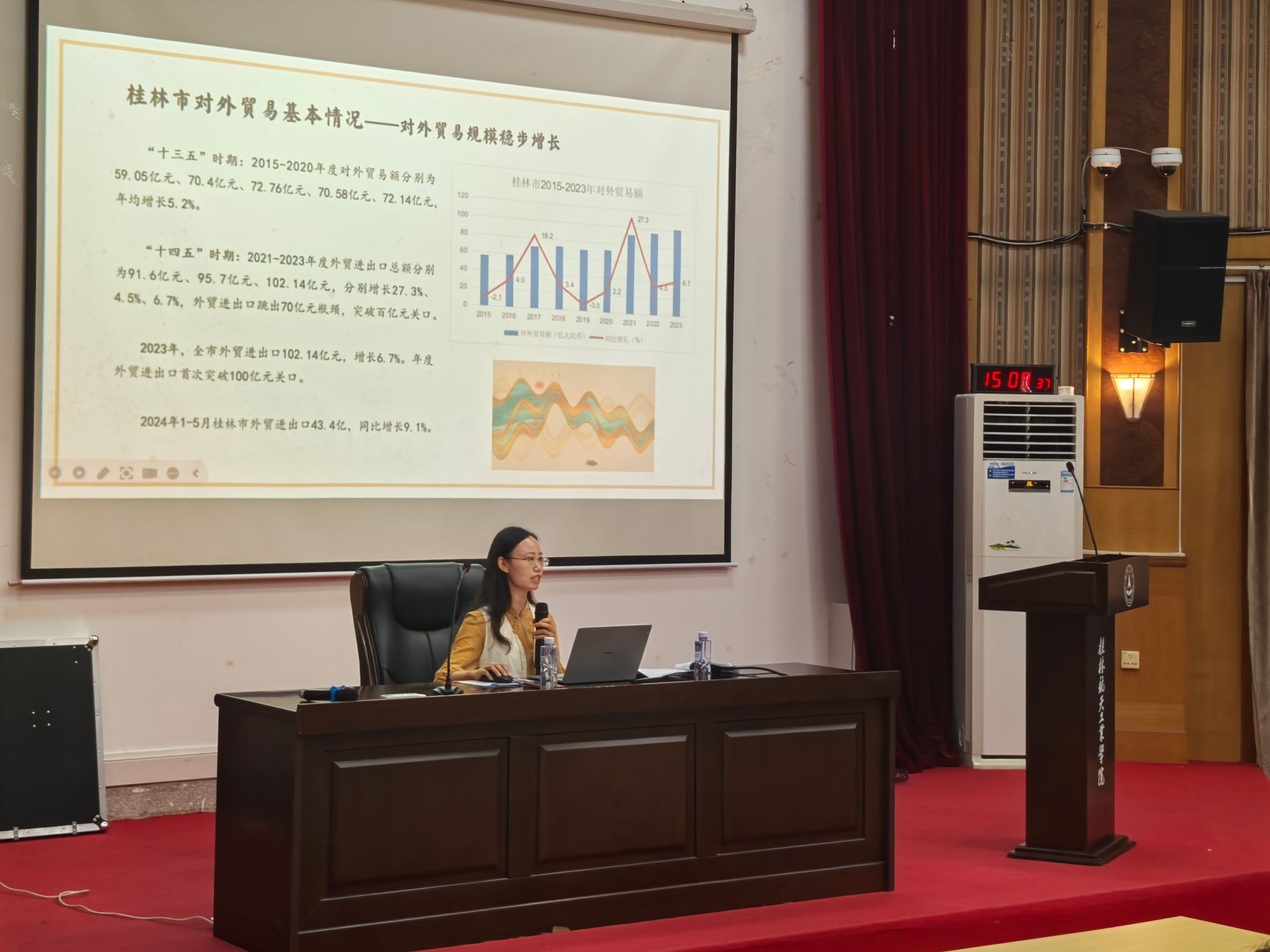 6月20日下午,桂林市商务局对外贸易科科长陈艺欣应邀来校开展了一场关于桂林市外贸发展的专题讲座。会议由外语外贸学院相关负责人主持,国际商务、关务与外贸服务专业学生参加讲座。