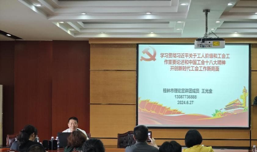 本次讲座特邀请原桂林市总工会二级调研员、桂林市教育工会主席、市职工大学客座教授王光金老师作《深入学习贯彻习近平总书记关于工人阶级和工会工作的重要论述和中国工会第十八次全国代表大会精神,开创新时代工会工作新局面》专题讲座。