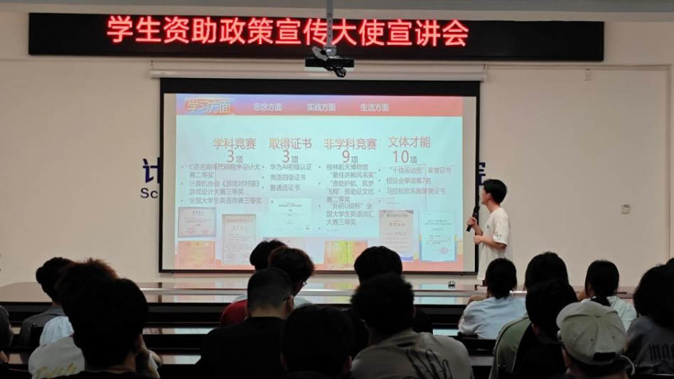学生资助政策宣讲活动,申燊同学作为学院资助宣传大使和国家励志奖学金获得者,结合自身经历与身边故事,详细讲解了从义务教育到高等教育阶段的资助政策及申请流程。分享了他积极参与“暖冬行动”、“乡村支教”等公益活动的实践经历,展示了他在“三下乡”活动中带领团队取得优异成果。现场同学们认真聆听、记录,参与互动。