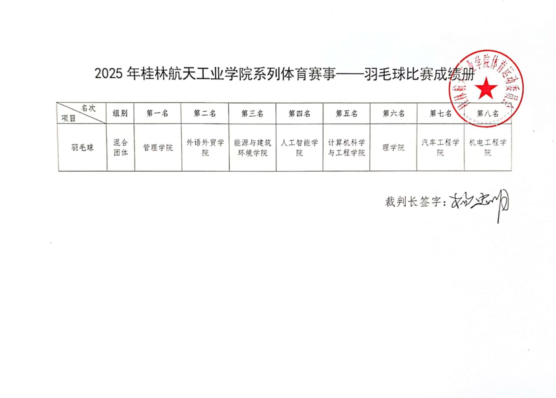 本次混合团体赛采用五场三胜制,比赛顺序依次为男单、女单、男双、女双、混双,且严格规定运动员不可兼项。经过两天的激烈角逐,最终管理学院代表队凭借出色的发挥,成功蝉联冠军宝座;外语外贸学院、能源与建筑环境学院、人工智能学院分别荣获亚军、季军和第四名;计算机科学与工程学院、理学院在比赛过程中,始终恪守体育道德,文明参赛,荣获本次比赛的道德风尚奖。