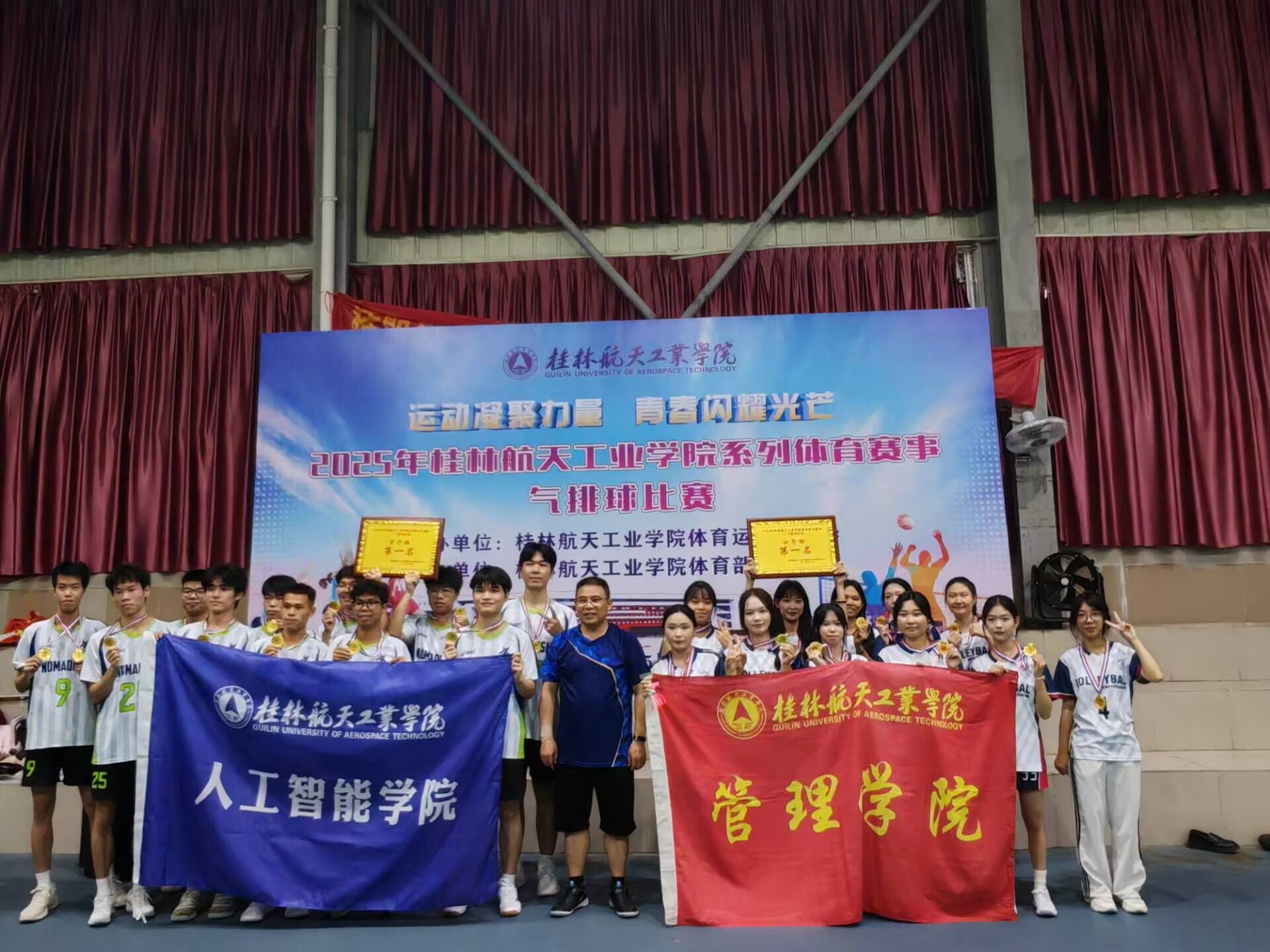 赛场上,球员们飞身救球,振臂高呼,场边观众呐喊助威声此起彼伏,将竞技热情推向高潮。经过小组赛、决赛两轮紧张激烈的角逐,最终名次尘埃落定:男子组人工智能学院、机电工程学院、管理学院分获冠、亚、季军;女子组管理学院、人工智能学院、外语外贸学院分获冠、亚、季军。