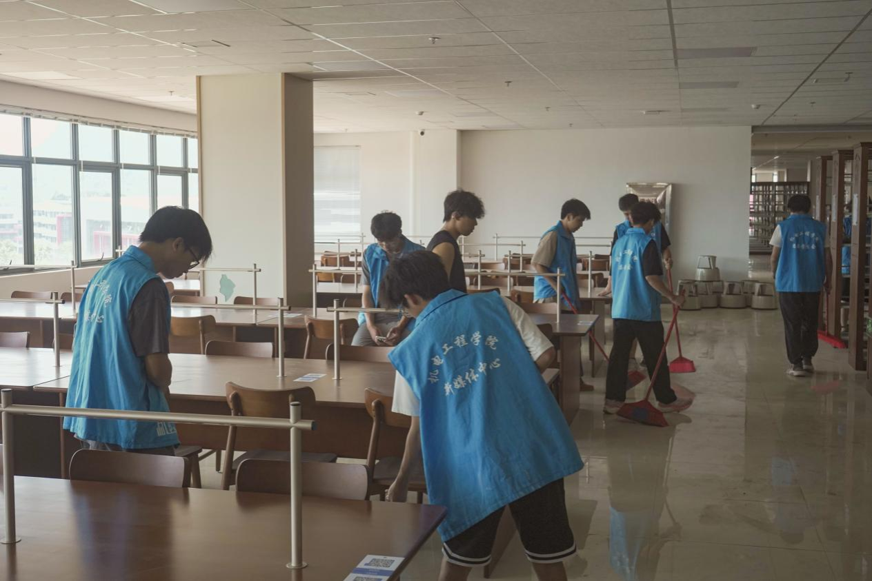 6月5日中午,机电工程学院近百名师生齐聚问天楼图书馆,开展开馆前卫生清扫志愿服务活动。此次活动由学院党员师生、学生会干部及新媒体中心学生干部共同参与,充分发挥“机电先锋”模范作用与组织协调能力,为新馆开馆营造洁净、有序的阅读环境。