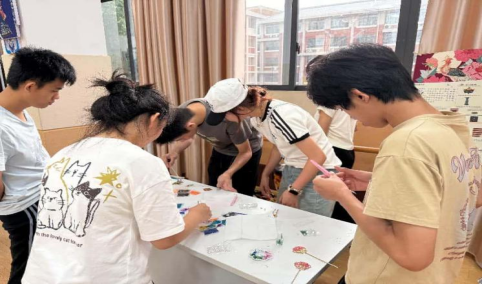 “我们希望通过沉浸式体验,让同学们直观感受非遗的魅力”团队负责人介绍到。在教学过程中,队员们采用图文演示、手势教学与一对一指导相结合的方式,确保每一个聋哑学生充分理解工艺步骤。学生们专注创作,完成的掐丝珐琅胸针、漆扇与扎染方巾等作品色彩明快、构思新颖,展现了非遗技艺在年轻一代手中的创新可能。