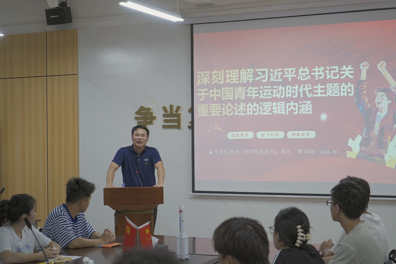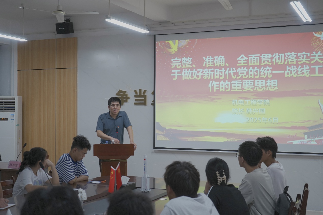 韩兴国以《完整、准确、全面贯彻落实关于做好新时代党的统一战线工作的重要思想》为题,聚焦机电工程领域的前沿动态,深入分析智能制造、绿色能源等行业的技术革新与产业趋势。他指出:“作为机电工程领域的未来建设者,党员同志要以‘把论文写在祖国大地上’的实干精神,锚定价值坐标,既要精研专业知识、突破技术瓶颈,又要以先锋模范作用带动团队,在服务国家战略需求中彰显青春担当。”他还特别强调,青年党员需在解决“卡脖子”技术难题、推动学院高质量发展中贡献智慧,以创新实践助力科技自立自强。