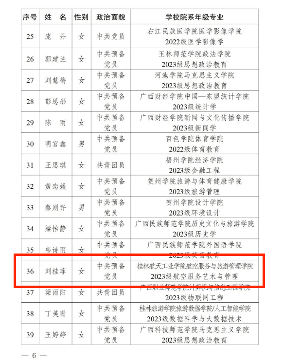 近日,2025年广西青年马克思主义者培养工程高校班入选名单公布,航空服务与旅游管理学院学生第二党支部预备党员、2023级航空服务艺术与管理专业刘桂菲,凭借扎实的政治理论学习,积极投身社会实践与校园建设的经历,从众多学生骨干中崭露头角成功入选。为开云入选此次“青马工程”高校班唯一学员,也是自2022年以来该支部再次有学生党员入选。