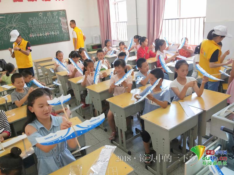 图为同学们把自己的心愿写在了飞机上,手举带着自己梦想的飞机模型和支教老师合影留念。孩子们的脸上都洋溢着开心的笑容。中国青年网通讯员 孙璐 摄