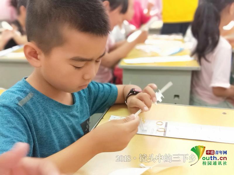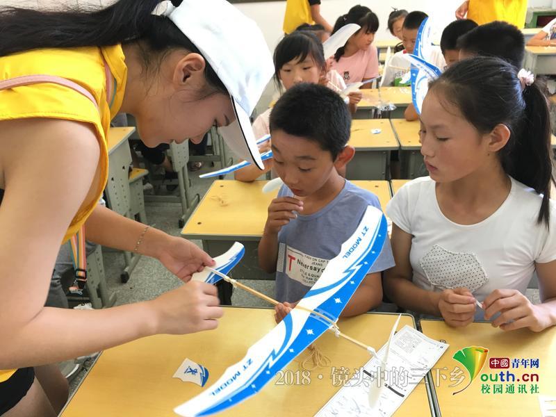 图为支教老师帮学生组装飞机模型,学生聚精会神的看着老师。中国青年网通讯员 朱璐 摄