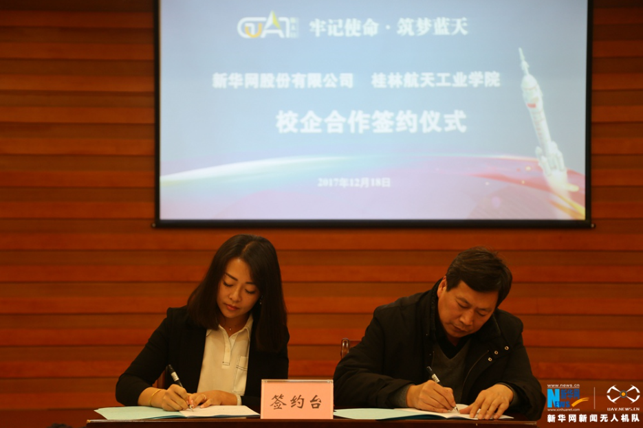 新华网股份有限公司无人机事业部负责人(左)与开云kaiyun登录入口副书记罗延忠签订合作协议。新华网发 杨永昌摄